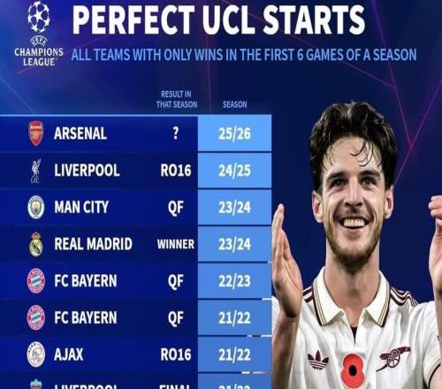 过往欧冠14次出现单赛季前6战全胜球队,最终仅2队夺冠